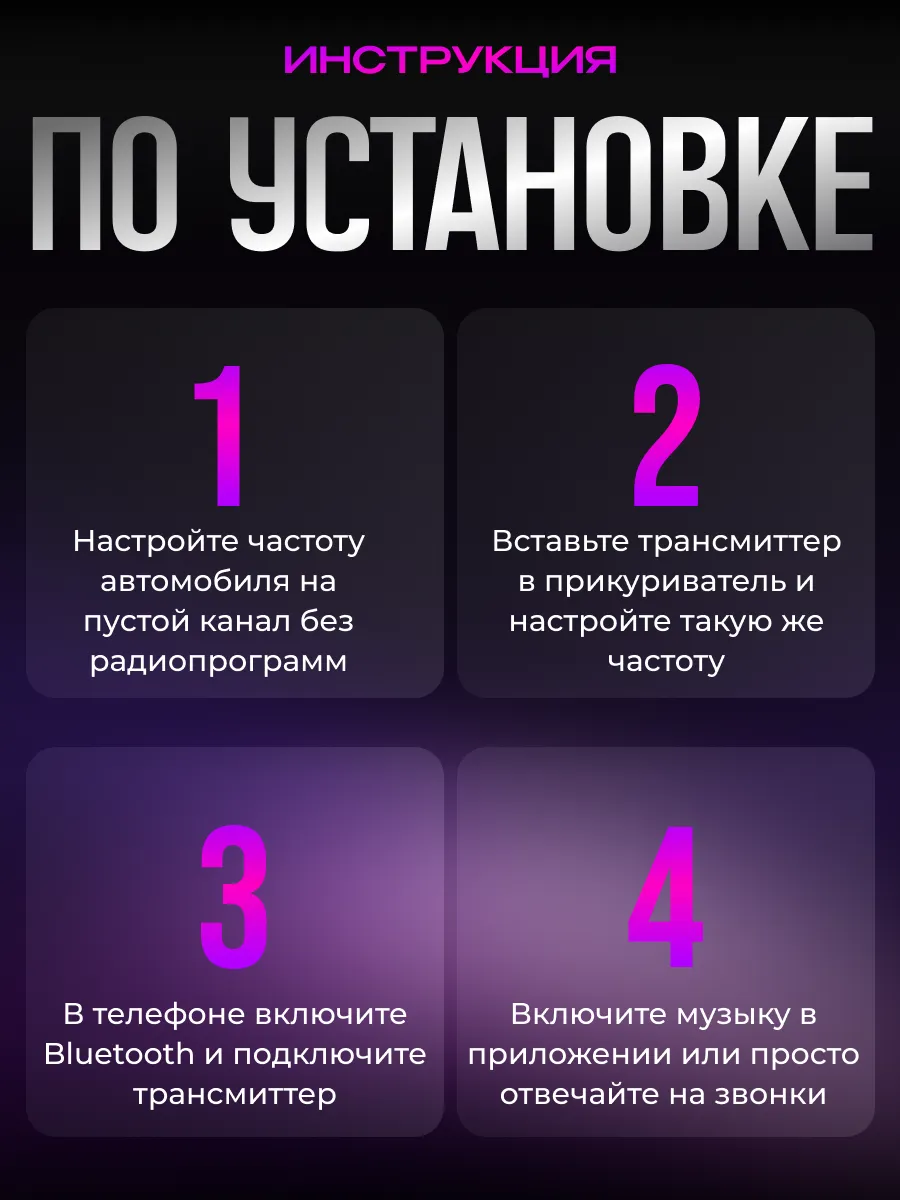 Не требует специальных знаний или инструментов. Просто подключите в прикуриватель, настройте свободную FM-частоту на магнитоле — и можно пользоваться.